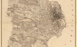 “Rare first edition of the U.S. Coast Survey map of the City of San Francisco and vicinity. Printed without color. Relief shown by contours and spot heights. Includes note and table of reference to public buildings. 1857 edition marked a significant improvement in the USCS's mapping of San Francisco. Prepared by A.F. Rogers, it captured the tremendous growth of the City, locating wharves, streets, buildings, roads, topographical features and places such as the Union Race Course and Pioneer Race Course, west of the City. While first issued and corrected in 1857, neither of the 1857 editions was never published in the regular annual Coast Survey reports until a revised edition, dated 1859, was issued.” davidrumsey.com