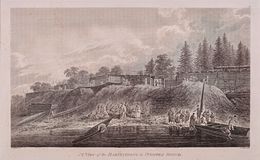 “A View of the Habitations in Nootka Sound”: Nootka Sound is in the Pacific Northwest, on the rugged west coast of Vancouver Island, which was originally known as King George's Sound. It separates Vancouver Island and Nootka Island in what is now known as the Canadian province of British Columbia. It played an important role in the maritime fur trade. The Nootka people are Native Americans who are related to the Chinook and Kwakiutl peoples, and the Nootka language is part of the Wakashan group of languages. In March 1778, Captain Cook landed on Bligh Island and named the inlet "King George's Sound". He recorded that the native name was Nutka or Nootka, “The houses, as I have observed, are above twenty in number, built nearly in a line.